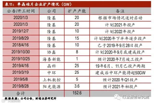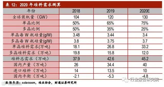 需求端:下游单晶硅片企业持续扩张。2019-2020 年单晶硅片企业开始新一轮快速扩张,2020 年硅片产量预期增加在 50GW 以上。本轮新扩产的硅片都是单晶产能,2020 年单晶占比将进一步提升,预计对单晶用料的需求大幅上涨。预计 2020年对单晶硅料的需求在 33 万吨以上,按照国内单晶硅产量占比 70%左右的比例,2020 年单晶硅料产量约为 25 万吨,海外也仅 9 万吨,单晶硅料市场处于紧平衡的状态。