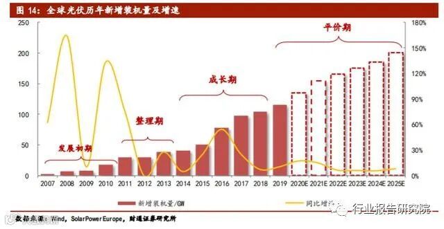 平价期 2019-2025 年:主要发展地在全球。伴随光伏工艺技术的不断进步和成本改善,光伏发电在很多国家已成为清洁、低碳、同时具备价格优势的能源形式,光伏开始进入全面平价期,全球光伏市场有望将开启新一轮稳健增长。