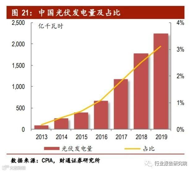 2019 年光伏新增装机量下滑,发电占比逐年提升。2019 年虽然我国光伏新增装机再次同比下降,但是新增和累计光伏装机容量仍继续保持全球第一。2019 年,我国新增光伏并网装机容量达到 30.1GW,同比下降 32.0%,其中分布式 12.2GW,集中式 17.9GW。截至 2019 年底,累计光伏并网装机量达到 204.3GW,同比增长17.1%;全年光伏发电量 2242.6 亿千瓦时,同比增长 26.3%,占我国全年总发电量的3.1%,同比提高 0.5pct。