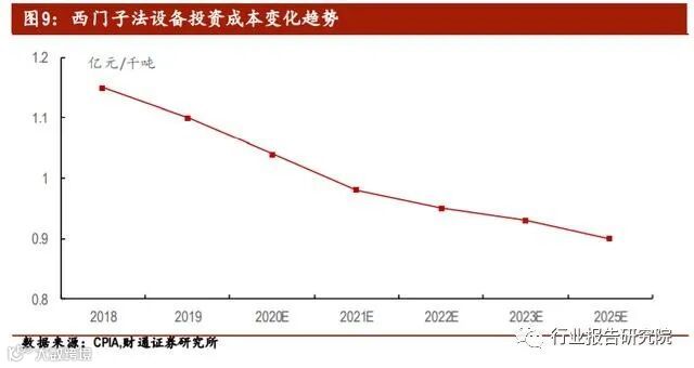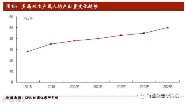 人均产出量快速提升,单位人工成本降低。随着多晶硅工艺技术瓶颈不断突破,工厂自动化水平的不断提升,多晶硅工厂的人均产出也快速提升。2019 年多晶硅生产线人均产出量为 35 吨/年,同比增长 25%。随着国内智能制造水平的提升,以及多晶硅单线生产规模的增大,未来多晶硅工厂的人均产出量将保持稳定提升,到 2025 年提高到 50 吨/年。