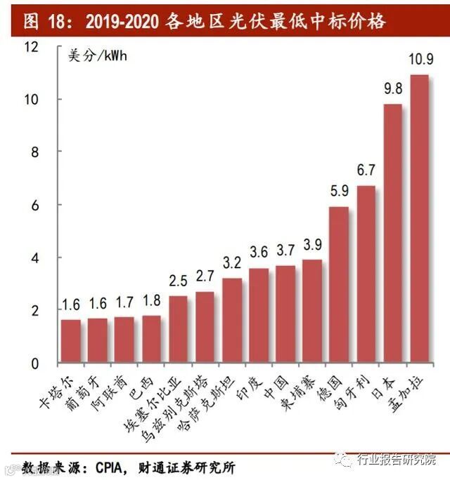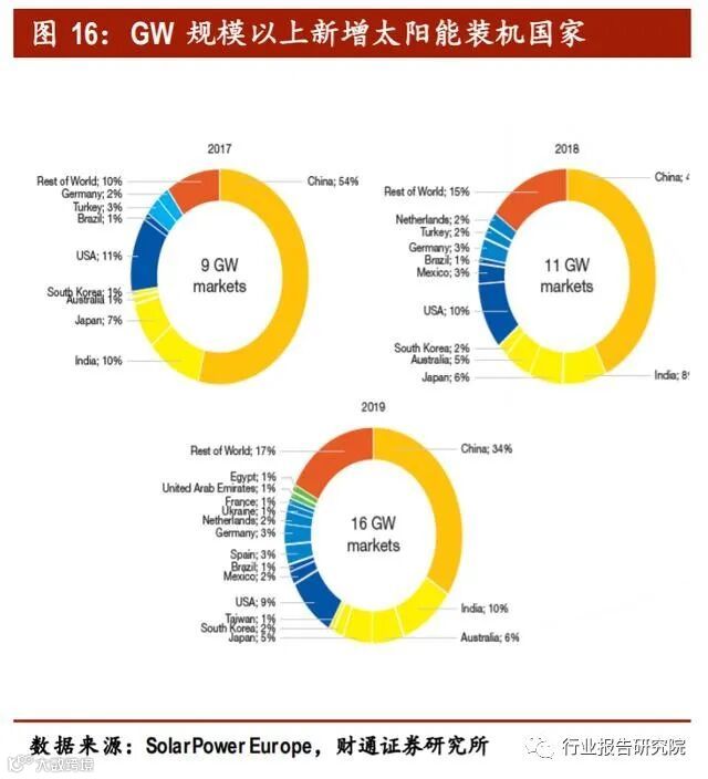 全球平价临近,海外市场持续爆发。近年来,光伏技术进步使得装机成本不断下行,2018 年全球光伏平均装机成本已到 1210.2 USD/kW。装机成本下行带来光伏发电性价比提升,全球平价市场正在逐步扩大。总结近期各地区光伏最低中标价格,光伏发电已经成为越来越多国家成本最低的能源发电方式。与此同时,全球 GW级光伏新增装机市场 2017-2019 年持续增长,分别达 9/11/16 个,2019 年新增国家为位于欧洲的法国、乌克兰、西班牙和位于中东的阿联酋、埃及。