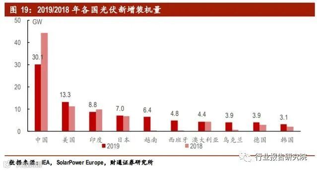 全球装机高增长,中、欧、美、印为主力。从各国年光伏新增装机量看,中国、欧盟、美国以及印度贡献主要力量。根据 IEA 及 PV InfoLink 数据,2019 年全球光伏新增装机约为 115GW,其中中国 2019 年光伏新增装机 30.1GW 继续位列全球第一,欧洲、美国以及印度分别以 14%、12%、8%的装机贡献占比位列其后,前四合计装机占比达 60%。根据全球光伏市场强劲的发展势头,预计 2020 年中、欧、美、印将继续贡献主要力量。