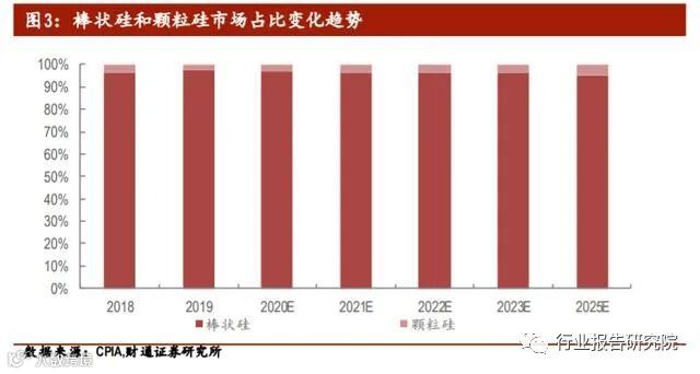 多晶硅制备工艺主要分为三氯氢硅西门子法和硅烷流化床法,产品形态分别为棒状硅和颗粒硅。当前主要的多晶硅生产技术主要有三氯氢硅西门子法和硅烷流化床法,其中三氯氢硅西门子法生产工艺相对成熟,2019 年采用此方法生产出的棒状硅约占全国总产量的 97.5%,预计未来仍将是主流生产工艺。但 N 型电池的发展将扩大颗粒硅的市场需求, 一旦颗粒硅解决生产稳定性、一致性、规模化以及产品质量的问题,不排除颗粒硅市场份额会出现快速增长。