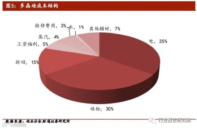 改良西门子法生产多晶硅成本中,电力、原材料、折旧占大头。在当前主流多晶硅生产法-改良西门子法的生产成本中,电力成本、原料成本和折旧成本是主要部分,三者合计占到总成本的 80%左右,其中电力成本占比最大,占比 35%;硅粉成本占比 30%;折旧成本占比达 15%。因而,电力、原材料、折旧成为降低多晶硅生产成本的主要领域。