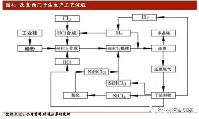 改良西门子法实现了生产过程的闭路循环。改良西门子法的工艺流程为:氯气和氢气合成氯化氢(或外购氯化氢);工业硅粉与氯化氢在合成流化床中合成 TCS气体;将 TCS 与高纯氢气送入还原炉中,经化学气相沉积反应生产高纯多晶硅。改良西门子法的闭路循环体现在:将还原炉还原过程中产生的污染副产品四氯化硅送到氢化反应环节将其转化为 TCS,进而实现循环利用。改良西门子法中,多晶硅还原炉是最重要的核心设备,改良西门子法可通过采用大型还原炉,降低单位产品的能耗。