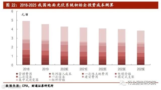 初始投资成本下降,光伏性价比突显。2019 年我国地面光伏系统的初始全投资成本为 4.55 元/W,较 2018 年下降 0.37 元/W,同比下降 7.5%。其中,组件成本约占投资成本的 38.5%,非技术成本约占 17.6%(不包含融资成本)。未来随着技术进步,组件将成为降低单瓦投资成本的重要一环,其占总投资成本比继续下降,其他成本虽有下降趋势但降幅不大。预计到 2020 年全投资成本可下降至 4.3 元/W。投资成本下行带动光伏平价范围进一步扩大,光伏投资性价比突显。