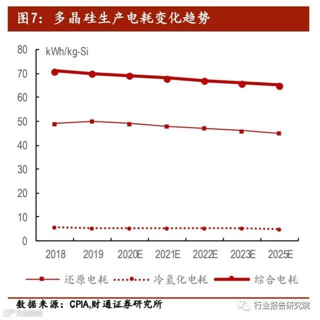 综合电耗逐渐降低,未来仍有下降空间。综合电耗是指工厂生产单位多晶硅产品所耗用的全部电力,包括合成、电解制氢、精馏、还原、尾气回收和氢化等环节的电力消耗。2019 年,全国多晶硅平均综合电耗已降至 70kWh/kgSi。未来随着生产装备技术提升、系统优化能力提高、生产规模增大等,预计至 2025 年还有 5%以上的下降空间。