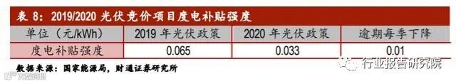 2020 年光伏竞价项目落地,补贴规模仍然可观,年内实现并网预期较强。2020年光伏发电项目建设方案,总体思路、项目管理、竞争配置延续 2019 年政策框架;平价项目 4 月底前报送;补贴预算总额度 15 亿元(户用 5 亿元,竞价 10 亿元)。近期国家能源局公布 2020 年光伏发电项目补贴竞价结果,竞价项目总规模达 25.97GW,符合我们此前 25GW 预期。此外,测算户用补贴项目规模约为 6-7GW,合计补贴对应项目规模约在 32GW 左右,整体补贴项目规模可观。此次竞价项目整体加权平价的度电补贴强度约为0.033元/kWh,较 2019 年0.065元/kWh下降 50%。相较 2019 年,本次项目逾期补贴降低仍维持 0.01 元/kWh,但由于此次度电补贴强度大幅降低,且组件价格下降预期较弱,预计 2020 年竞价项目大部分有望在年底前实现并网。