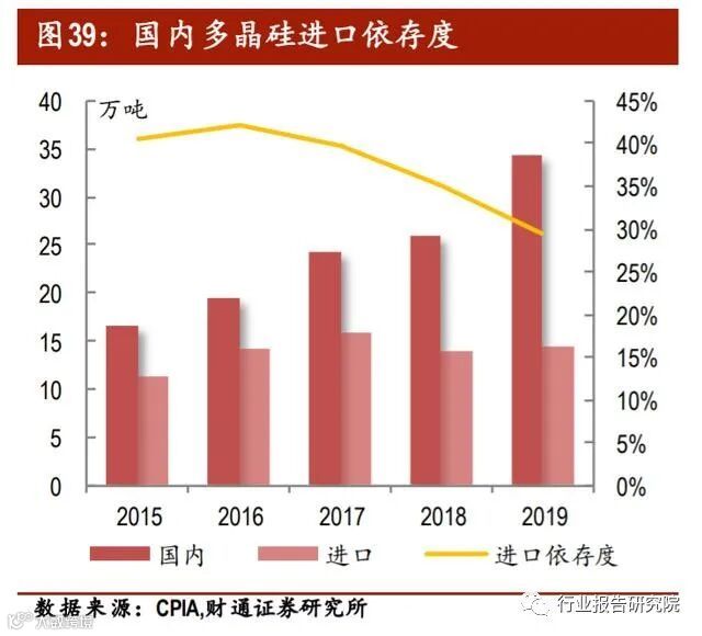 进口依存度下降,国产替代加速。光伏产业链上,除多晶硅料之外的占比均超过70%,国内硅片、电池片和组件的全球份额占比达到 97.4%,78.7%和 71.3%。过去几年海外硅料新增扩产较少,随着我国优质硅料产能的陆续投放,国内多晶硅料进口依存降进一步降低,国内多晶硅料产量占比从 2015 年的 48.5%上升至 2019年的 67.3%,2019 年进口占比也下降到了 30%以下。
