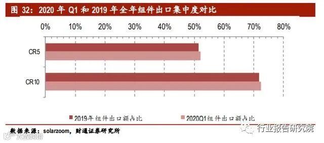 组件出口数据佐证,行业集中度被动提升。组件作为光伏产业链中中小企业参与度最高的一环,行业集中度受此次疫情影响提升显著。从最新组件出口数据看,2020Q1 龙头企业出口集中度 CR5 和 CR10 分别达 52.1%和 72.5%,较 2019 年全年提升 0.66pct 和 0.65pct。在此次疫情影响背景下,行业龙头企业资源调配和贸易渠道掌控方面优势得以突显,二三线企业加速退出市场,行业集中度被动提升。
