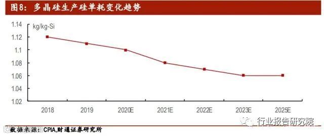 硅单耗稳步下降。硅单耗指生产单位高纯硅产品所耗费的硅量,主要包括合成、氢化工序,外购硅粉、三氯氢硅、四氯化硅等含硅物料全部折成纯硅计算,外售氯硅烷等按含硅比折成纯硅计算,从总量中扣除。2019 年,行业硅耗在 1.11kg/kg-Si水平,基本与 2018 年持平。随着氢化水平的提升,副产物回收利用率的增强,预计到 2025 年将降低到 1.06kg/kg-Si。