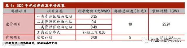 光伏竞价结果落地,大部分项目年内有望实现并网。2020 年 3 月 10 日能源局下发《关于 2020 年风电、光伏发电项目建设有关事项的通知》,总体思路、项目管理、竞争配置延续 2019 年政策框架。2020 年 6 月底,国家能源局公布 2020 年光伏发电项目补贴竞价结果,竞价项目总规模达 25.97GW,符合我们此前 25GW 预期。此次竞价项目整体加权平价的度电补贴强度约为 0.033 元/kWh,较 2019 年 0.065元/kWh 下降 50%。相较 2019 年,本次项目逾期补贴降低仍维持 0.01 元/kWh,但由于此次度电补贴强度大幅降低,且组件价格下降预期较弱,预计 2020 年竞价项目大部分有望在年底前实现并网。