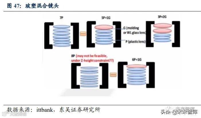 玻塑混合镜头突破瓶颈,有望应用于主流高端机型。目前常见的摄像头有塑料镜片 和玻璃镜片,塑料镜片成本低、易批量生产,成为手机镜头的主流,但其成像清晰度有 限,失真率过高,难以跟上目前手机摄像头超高像素趋势。玻璃镜片性能更好,但其量 产难度大,生产成本高,难以在手机领域广泛应用。为了让图像更加清晰真实,目前已 发展到 8P 镜头,但镜片太多,镜头厚度会相应增加,不利于手机轻薄化,而且塑料镜 片清晰度有限,太多塑料镜片也会提高失真率,此时玻塑混合镜片的出现突破了性能瓶 颈。玻塑混合镜头将塑料镜片和玻璃镜片混合使用,成像清晰度比塑料镜片高,成本也 介于塑料镜片与玻璃镜片之间,6 片塑料镜片+1 片玻璃镜片组成的玻塑混合镜头成像效 果与 8 片塑料镜片相当,但其镜片数少,镜头厚度有所改善,所以玻塑混合镜头有望应 用于主流旗舰机型。