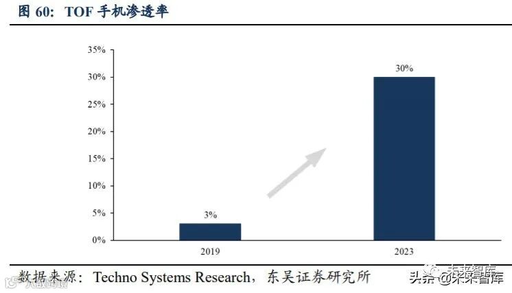 5G 时代搭载 TOF 镜头将成为未来趋势。从人脸识别到 AR/VR 虚拟现实,TOF 有望接力结构光,带来手机产业的全新升级,前置人脸识别+后置虚拟现实功能可能成为 手机下一个发展趋势。对手机来说,TOF 比结构光更适合于 3D 视觉成像技术。TOF 前 置镜头也能应用于面部识别解锁,加上 TOF 自身的优良特性,用户体验好,而且 TOF 成本较低,应用范围更广,更为手机厂商所青睐,越来越多的厂商开始尝试后置摄像头 TOF 方案。5G 商用为手机 3D 视觉的应用迎来新的发展机遇。在 5G 技术的支持下,TOF 镜头将会逐步运用以满足 VR/AR 游戏场景等需求,5G 时代搭载 TOF 镜头将成为趋势。根据 Techno Systems Research 数据,2019 年采用 TOF 的智能手机渗透率为 3%,到 2023 年渗透率有望突破 30%,成为中高端机型的标配。