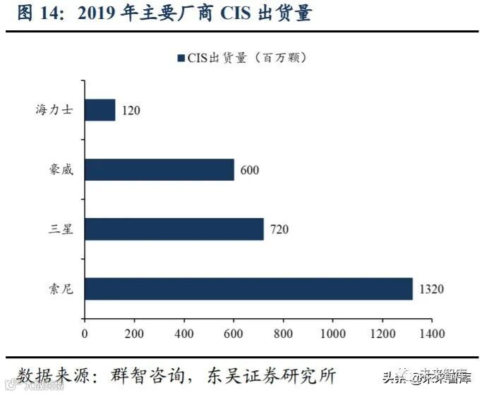 市场集中度高,龙头企业遥遥领先。根据 Yole 数据,CIS 市场集中度较高,CR3 为 80.2%,其中索尼占比 49.2%,三星占比 19.8%,豪威占比 11.2%。根据群智咨询数 据,2019 年 CIS 全球出货量 47 亿颗,出货量前三名分别为索尼(13.2 亿颗),三星(7.2 亿颗),豪威(6 亿颗),排名前三厂商出货量遥遥领先其他厂商,龙头地位稳固。