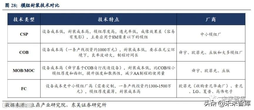 大厂商长期成本优势显著,技术更迭市场集中度有望提高。舜宇、欧菲光等较大的 模组厂商均使用 COB 技术进行封装,设备成本高但封装成本低,属于高端工艺,长期 而言,产品成本较低,有利于企业的长期发展,这是大厂商的显著优势,而中小厂商考 虑到初始成本和风险规避,大多选择设备成本较低的 CSP,但由于封装成本高,属于低 端工艺,长期而言,产品成本相对较高,在下游要求不断提升的趋势下,中小企业在长 期竞争中处于劣势。FC 是苹果特有的封装技术,主要是索尼、LG、夏普等厂商在使用,产出的模组厚度最薄但设备成本和封装成本均较高。在 COB 技术改进后的 MOB、MOC 虽然初始成本高,但封装成本低,模组厚度较薄,对大厂商而言是性价比较高的封装技 术,未来有望取代 COB 和 FC,成为大厂商偏爱的封装技术。由于新冠病毒疫情和技术 更迭的冲击,中小厂商的生存将愈加困难,未来市场集中度有望逐步提升。