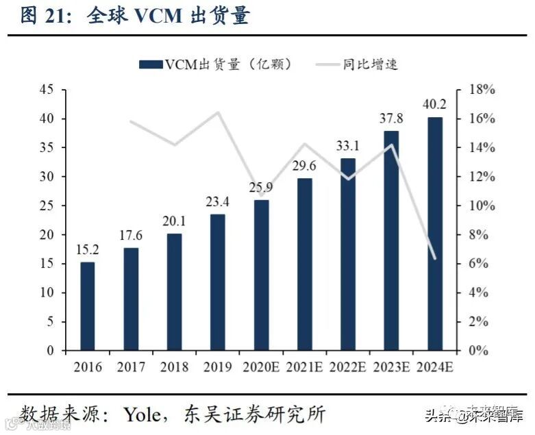 VCM 市场规模及出货量持续上升。根据 Yole 数据,2016-2019 年,VCM 市场规模 从 17 亿美元增长到 24 亿美元,CAGR 为 9%,预计 2024 年达到 44 亿美元;出货量方 面,2016-2019 年,出货量从 15.2 亿颗增长到 23.4 亿颗,CAGR 为 11.39%,预计 2024 年增长到 40.2 亿颗。