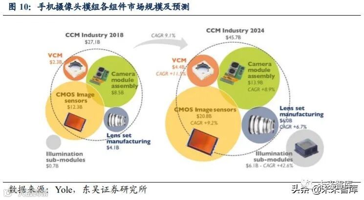 需求增长+技术升级推动手机摄像头各组件及整体市场规模扩张。根据 Yole 数据, 2018-2024 年,CIS 市场规模将从 123 亿美元增长到 208 亿美元,CAGR 为 9.2%;镜头 市场规模将从 41 亿美元增长到 60 亿美元,CAGR 为 6.7%;音圈马达市场规模将从 23亿美元增长到 44 亿美元,CAGR 为 11.5%;模组封装市场规模将从 85 亿美元增长到 139 亿美元,CAGR 为 8.9%;全球手机摄像头市场规模将从 271 亿美元增长到 457 亿美元, CAGR 为 9.1%。受益于下游需求增长及技术升级,从摄像头各组件到整体都有望迎来 高速增长期,行业景气度持续提升。
