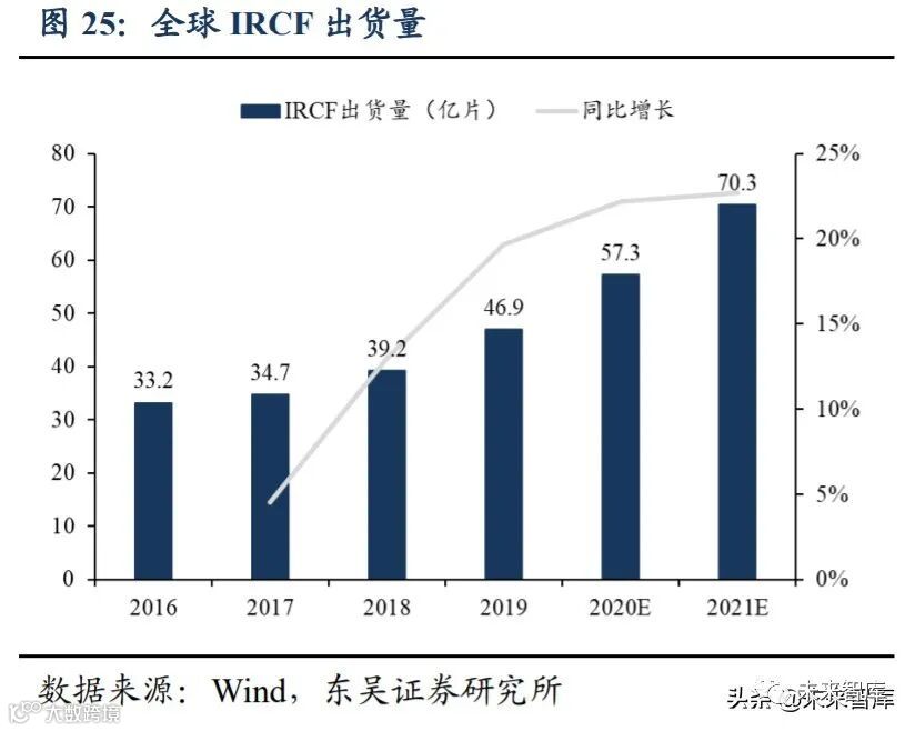 市场规模持续增长,IRCF 量价齐升。根据旭日大数据的数据,2016-2019 年全球 IRCF 市场规模从 44 亿元增长到 68 亿元,CAGR 为 11.5%,根据 Wind 数据,全球 IRCF 出货量也在不断升高,2016 年出货量 33.2 亿片,2019 年攀升至 46.9 亿片,同时每片单 价从 2016 年的 1.32 元,增长到 2019 年的 1.45 元,IRCF 市场呈现量价齐升的趋势。