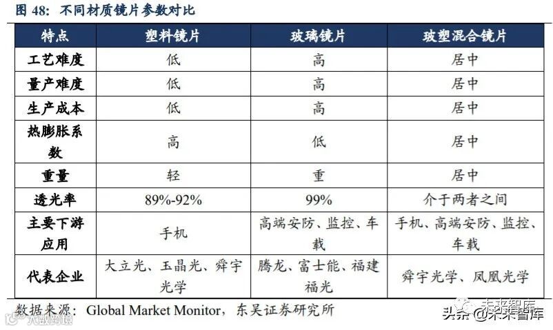 玻塑混合镜片有望成为镜片发展新趋势。摄像头镜片主要分为塑料镜片、玻璃镜片 和玻塑混合镜片。虽然塑料镜片透光率存在一定劣势,但是由于手机镜头需求量大且对 成本要求高,塑料镜片在工艺难度、量产难度、成本等方面优势便体现出来,因此目前 手机镜头多以塑料镜片为主,而手机市场应用占比 80%以上,这也是龙头厂商多集中于 塑料镜片的原因。而在安防车载领域,对镜片透光率要求更高,而对成本相对不敏感, 所以更多使用玻璃镜片。玻塑混合镜片透光率高于塑料镜片,量产难度与成本低于玻璃 镜片,且可应用领域更为广泛,在手机、安防、车载领域均有使用,对于提升相片质量 是较优的选择,因此玻塑混合镜片有望在未来得到广泛应用。