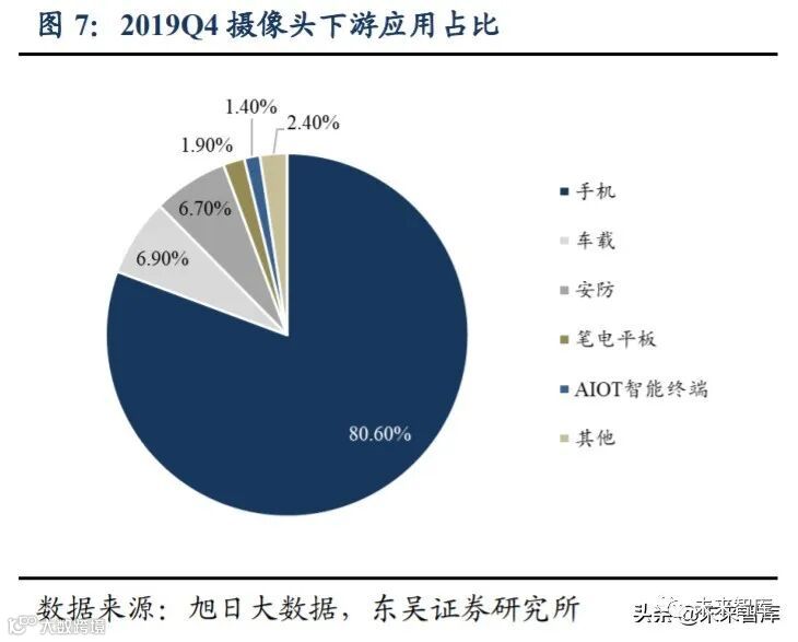 光学摄像头市场规模不断增长,手机成核心增长动力。根据 Yole 数据,全球摄像 头行业规模不断扩大,到 2022 年有望超过 450 亿美元,2016-2022 年 CAGR 为 12.2%, 行业保持持续稳定增长。从摄像头下游应用来看,手机占据绝对优势,2019Q4 占有率 超过 80%,是摄像头行业最为核心的应用领域