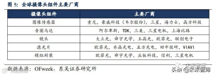 摄像头主要由五部分组成。根据旭日大数据,摄像头各组成部分功能及成本占比各 不相同,主要包括图像传感器(将表面的上镜头送过来的光信号转化成为电信号),在 摄像头组件成本中占比 52%;镜头(收集光线然后将物体成像到图像传感器),在摄像 头组件成本中占比 20%;音圈马达(推动镜头移动实现对焦,通过移动镜头可以得到清 晰的照片),在摄像头组件成本中占比 6%;红外截止滤光片(过滤多余的红外光和紫外 光,使得拍摄出来的图像颜色更加接近我们人眼所看到的颜色),在摄像头组件成本中 占比 3%;以及最终的模组封装(将摄像头零组件整合到一起成为完整的摄像头),在摄 像头成本中占比 19%。