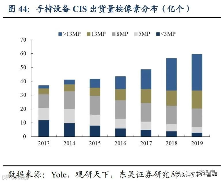 高像素 CIS 出货量激增。随着高像素镜头用量增加,与之匹配的高像素 CIS 出货量 也同步上升,根据 Yole 及观研天下数据,2013-2019 年,5MP 及以下的 CIS 出货量自 21 亿个降至 7 亿个,13MP 像素及以上的 CIS 出货量自 6 亿个大幅增长至 39 亿个,高 像素 CIS 出货量迅速提升。