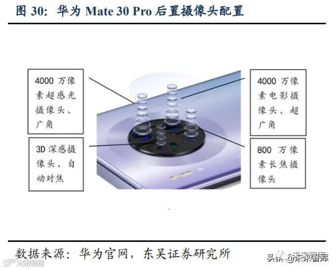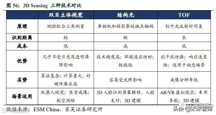 目前主流应用技术为结构光与 TOF。结构光与 TOF 技术由于原理差异,应用领域 也不相同。结构光由于测距较近、对照明系统要求较高,适用于安全性要求高而测量距 离较近的场景,比如人脸识别、AOI 检测等,苹果是目前结构光技术应用的主力军,预计未来苹果新机在前置将继续延用结构光方案。而 TOF 凭借其不容易受外界光干扰、 刷新响应速度快的特性适用于测量远距离场景,除了手机之外应用范围广泛,比如 3D 建模、游戏、汽车导航、AR 等,未来 TOF 在单部手机上的应用也会增多,目前华为 Mate30 Pro 机型已经配置前后 TOF 镜头,单机光学价值量大幅提升。