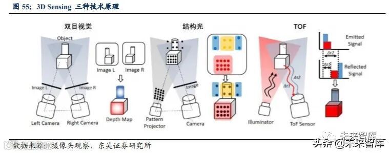 实现 3D Sensing 的技术有三种:双目立体成像、结构光和 TOF。其中结构光技术 最为成熟,已经大规模应用于工业 3D 视觉领域,TOF 则由于自身特性快速在手机等移 动终端加以应用。