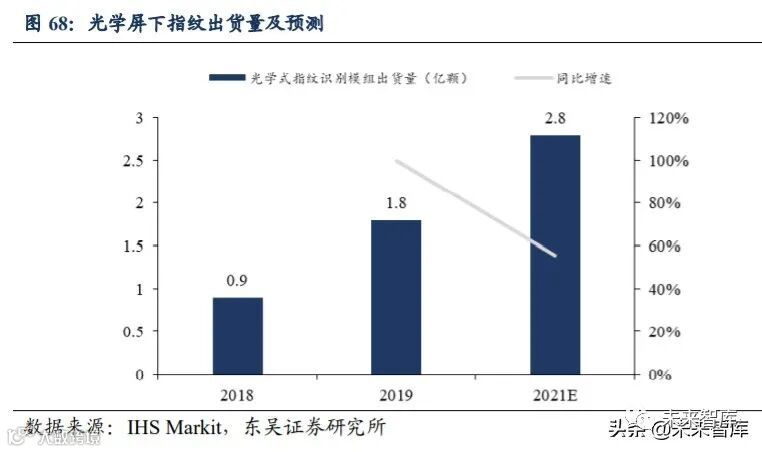 全面屏需求驱动光学指纹渗透率提升。目前,光学指纹识别产业链成熟,供应商数 量较多。光学式屏下指纹识别凭借其技术优势、成熟的供应链和良好的用户体验,取得 了大部分的市场份额。根据 Trendforce 数据,2019 年屏下指纹识别中,光学占 82%,超 声波占 18%。当下,全面屏手机已经成为智能手机选择的主流,随着光学屏下指纹识别 技术的进一步成熟,成本会快速下降,运用光学屏下指纹方案的手机厂商会逐步增多。同时,随着 2020 年 LCD 屏下指纹识别方案量产,光学屏下指纹技术将会下沉到千元机 的市场,渗透率将会得到快速提升。根据 IHS Markit 数据,2019 年光学式指纹识别模 组的出货量为 1.8 亿颗,2021 年出货量有望超过 2.8 亿颗。