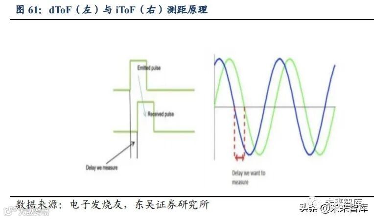 iTOF 和 dTOF 原理各不相同。激光雷达发射的光波存在两种调制方式:直接飞 行时间(dToF)测量和间接飞行时间(iToF)测量,dToF 和 iToF 的原理区别主要在 于发射和反射光的区别。dToF 即直接发射一个光脉冲,之后测量反射光脉冲和发射光 脉冲之间的时间间隔,就可以得到光的飞行时间。而 iToF 发射的并非一个光脉冲,而 是调制过的光,由于接收到的反射调制光和发射的调制光之间存在相位差,通过检测 该相位差就能测量出飞行时间,从而估计出距离。