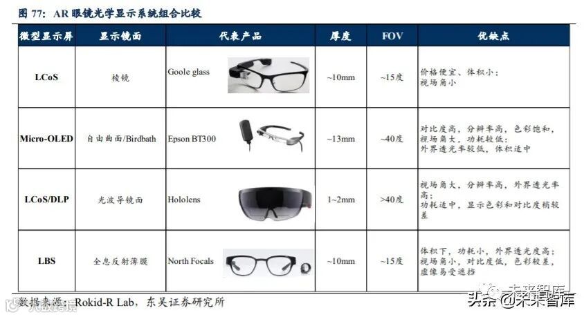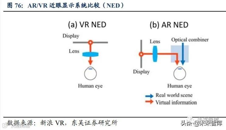 微型显示器和光学元件组合是 AR 眼镜成像关键。一般来说,对于 AR/VR 等智能 眼镜的硬件部分由近眼显示(NED)、应用处理系统(AP)、外观设计等构成,其中近眼 显示(Near-eye Display,简称 NED)是 AR/VR 硬件设备的核心所在,旨在将显示器上的像 素通过光学元件成像,形成虚像并投射在人眼中。其中,AR 相比于直接显示虚拟图像 的 VR 技术来说,因其成像系统不能挡在视线前方,需要实现透视,所以需要多加一组 光学组合器以“层叠”的形式,将虚拟信息和真实场景融为一体。目前,AR 眼镜的显 示系统多为包括 LCOS、LBS、Micro OLED 等微型显示屏和棱镜、自由曲面、光波导、 Birdbath 等光学元件的组合,这些光学元件是决定 AR 眼镜成像效果的关键。