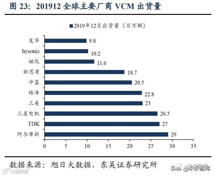 VCM 技术壁垒低,市场结构分散。VCM 的技术并不复杂,但由于对灵敏度的要求 较高,所以生产时的精度控制是关键,这涉及到设计、材料等各个环节的改进。正因为 VCM 技术难度并不高,所以全球参与 VCM 产业的厂商有上百家,市场较为分散,根 据第一手机界研究院数据,CR3 仅为 44.4%,未超市场的一半,没有绝对的龙头,市占 率最大的阿尔卑斯也仅有 17%的分额,市场呈现多寡头对峙格局。根据旭日大数据,2019 年 12 月全球 VCM 出货量前三的厂商分别为阿尔卑斯(2900 万颗)、TDK(2700 万颗)、 三星电机(2650 万颗),但与后续几名差距不大。