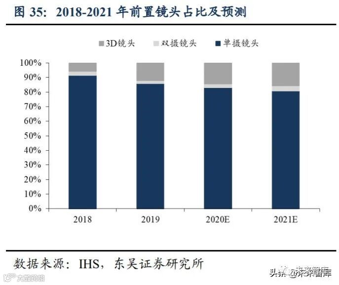 前置 3D 摄像有望增加。根据 IHS 数据,2018-2021 年,前置单摄镜头、双摄镜头 出货量基本稳定不变,而 3D 镜头出货量将 0.85 亿颗增长 2.7 亿颗,其占比也由 5.65% 升至 15.64%。