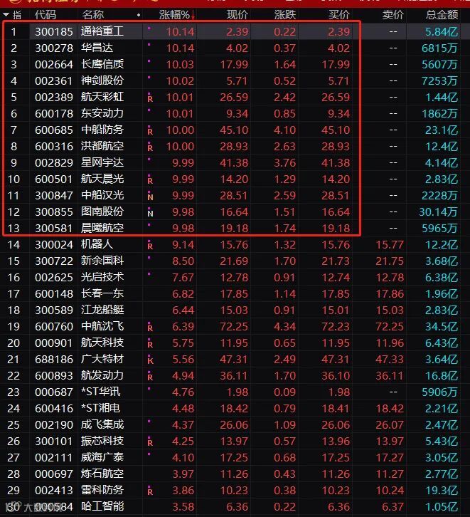 军工板块中超10只个股涨停,航天彩虹、中船防务、航天晨光、中船汉光等涨停。
