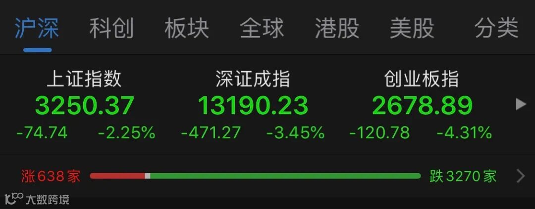 截至午间收盘,沪指跌2.25%,报3250.37点,深成指跌3.45%,报13190.23点,创业板指跌4.31%,报2678.89点。两市成交额约7000亿元;北向资金净流入近120亿元。