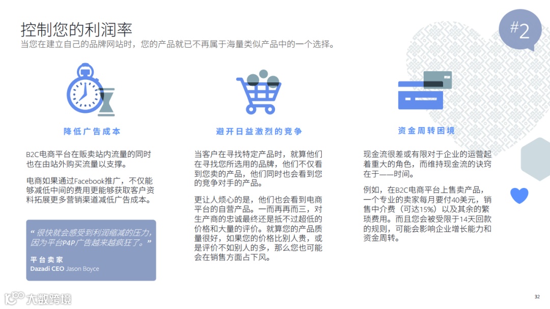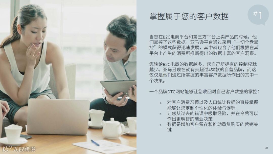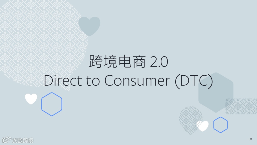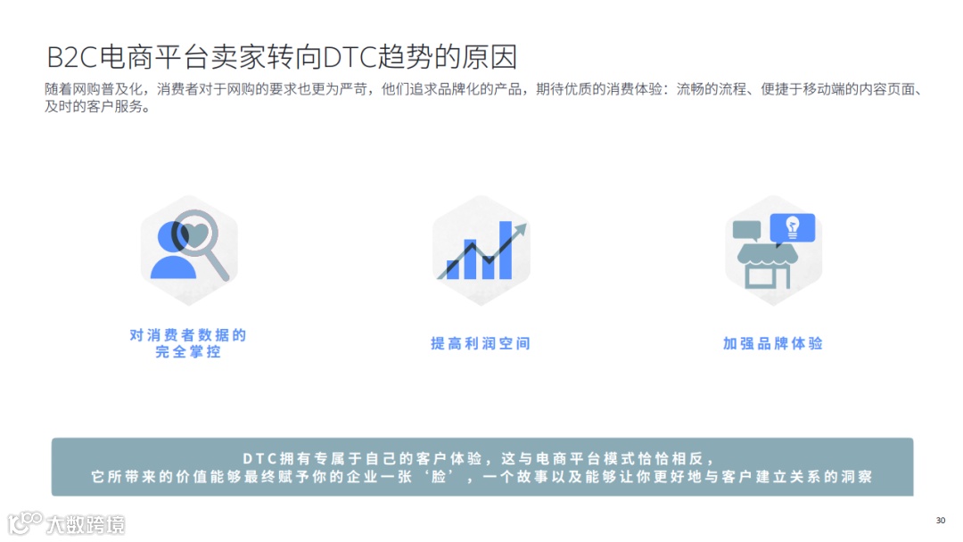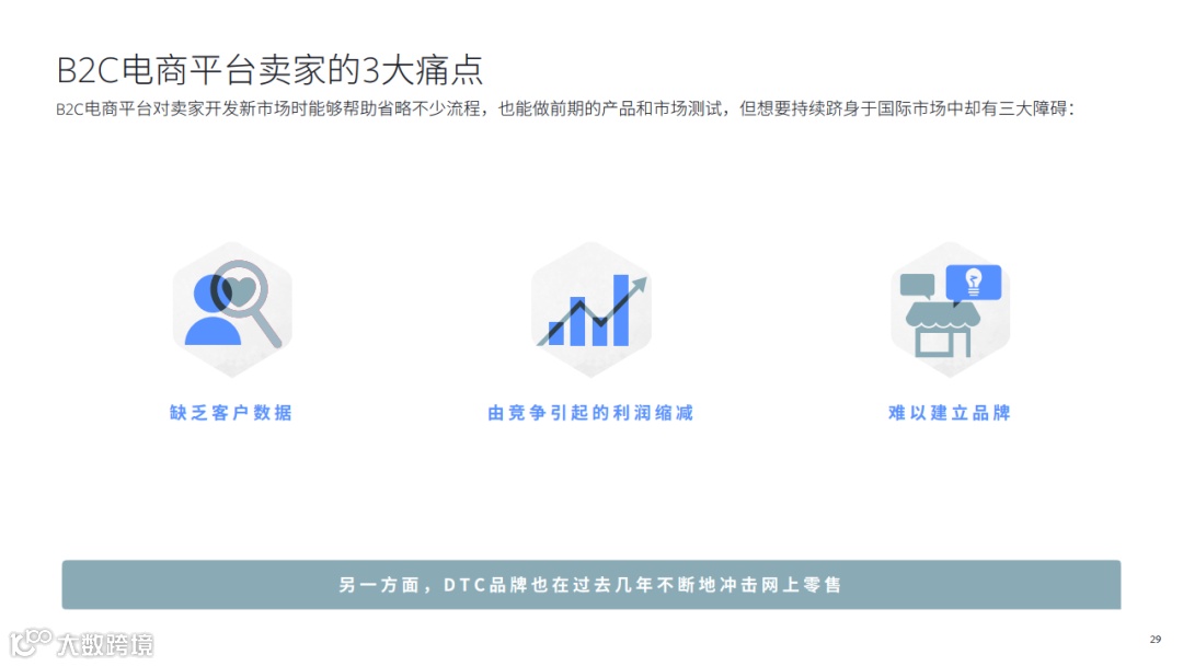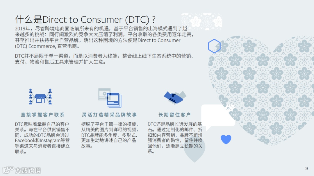 与此同时,基于平台的销售模式正面临越来越多的挑战,如同行间竞争激烈,压低商品利润等。在现有态势与消费者的希冀推动之下,“以消费者为终端,整合线上线下生态系统中的营销、支付、物流和售后工具来管理并扩大生意”的DTC(Direct to Customer)模式兴起,跨境电商进入2.0时代,转型可谓势不可挡。
