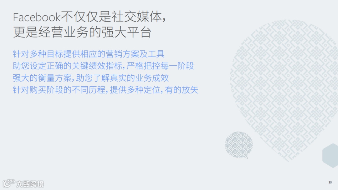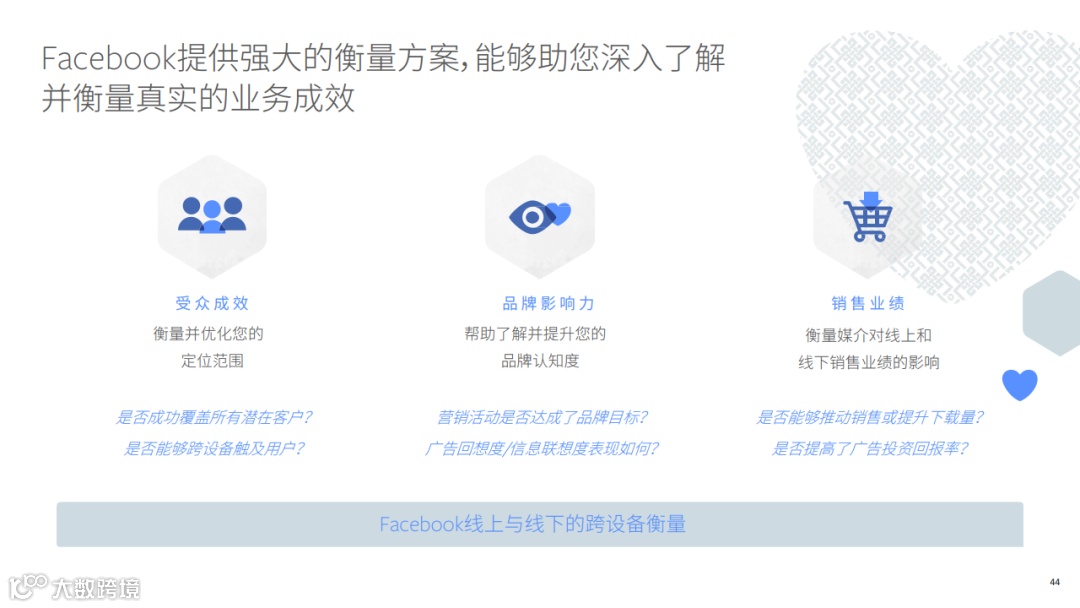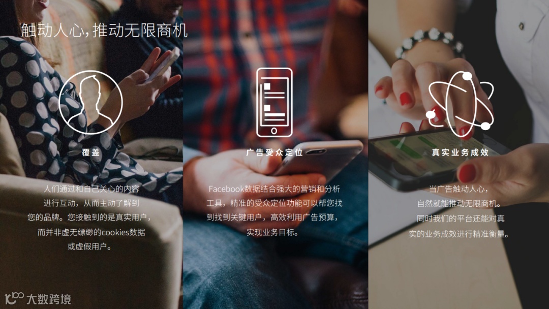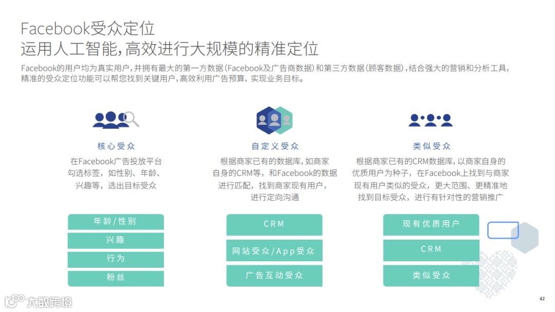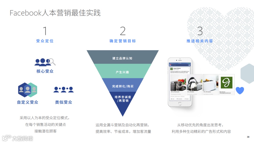 Facebook为拥有独立站的商家带来的流量是源源不断,且极度优质的。“以人为本”的Facebook针对不同营销目标提供相应的广告工具和方案,助力商家设定正确的关键绩效指标,而精准的衡量方案则帮助商家了解真实的业务成效。同时根据购买阶段的不同历程,提供多种定位,有的放矢。简单来说,Facebook全球化地优化秘籍包括:发觉新洞察、精准受众(核心受众、自定义受众、类似受众)和本地化素材。
