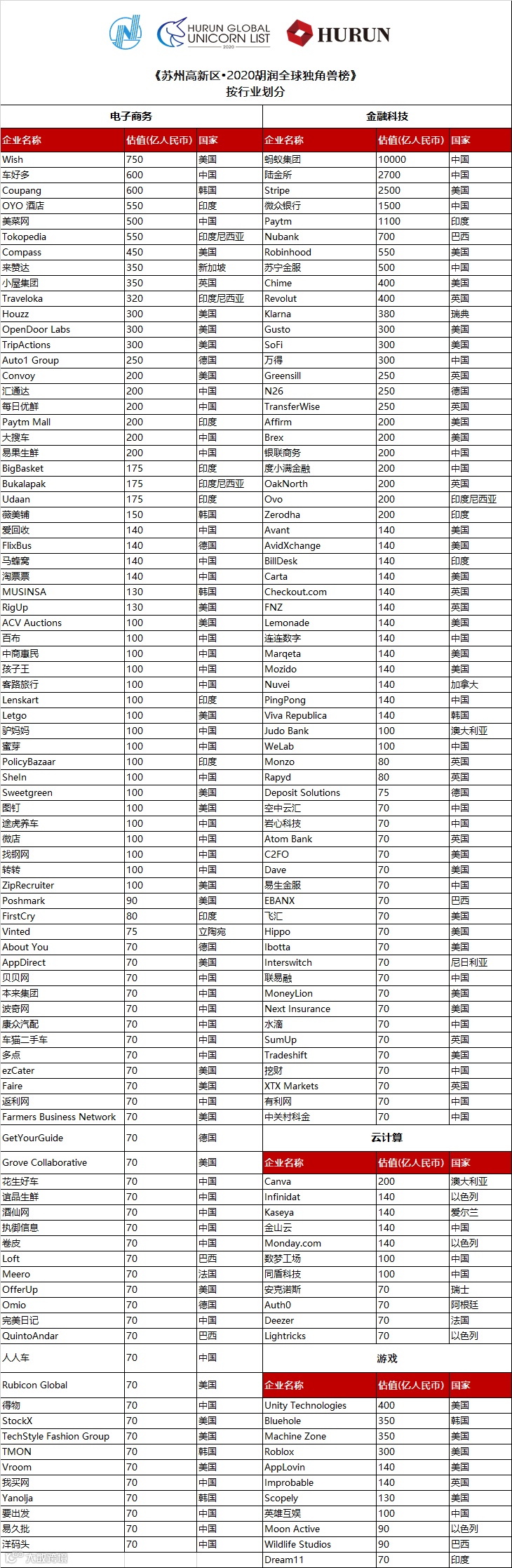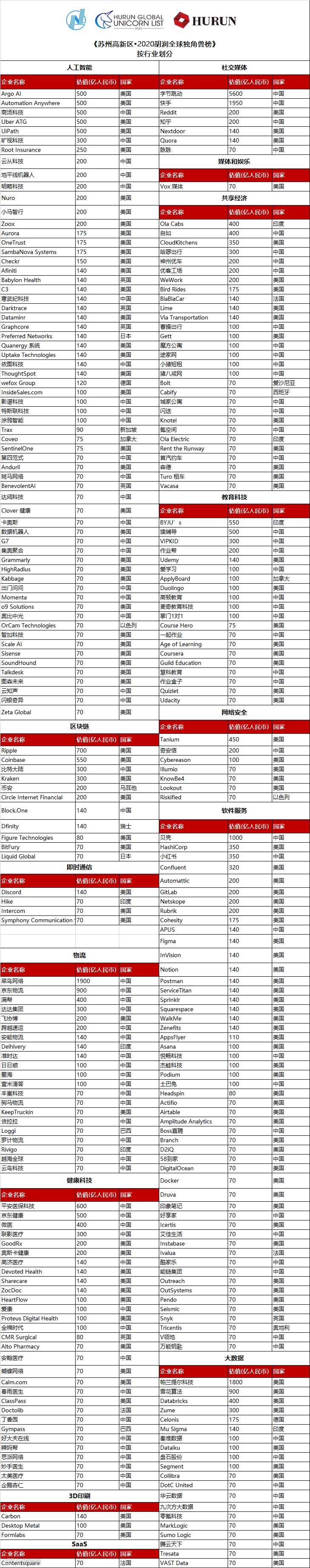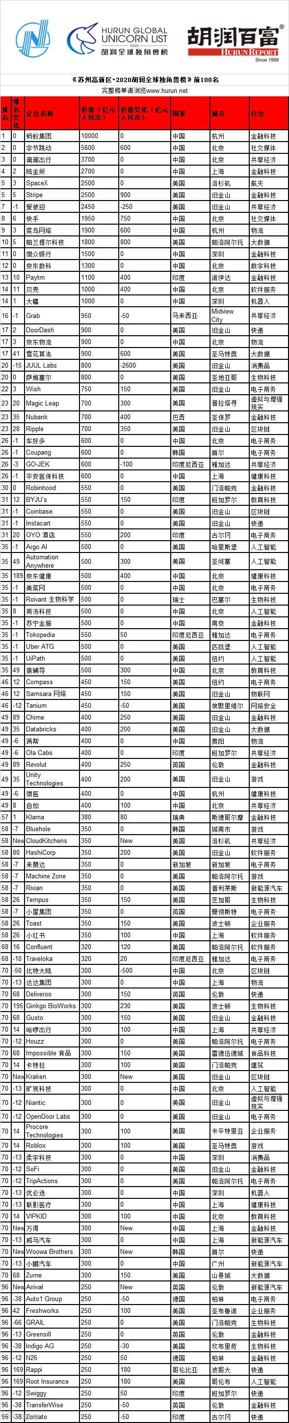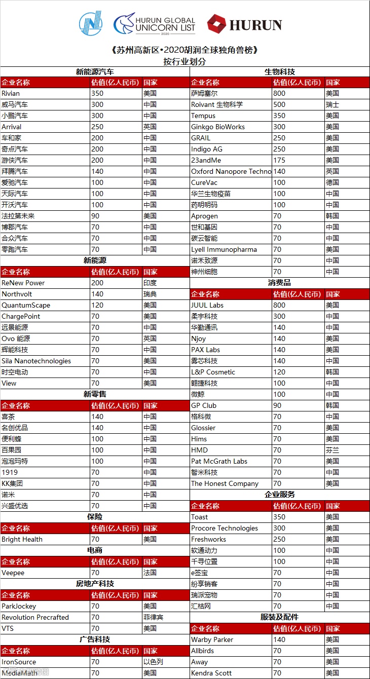 《苏州高新区•2020胡润全球独角兽榜》估值计算的截止日期为2020年3月31日。