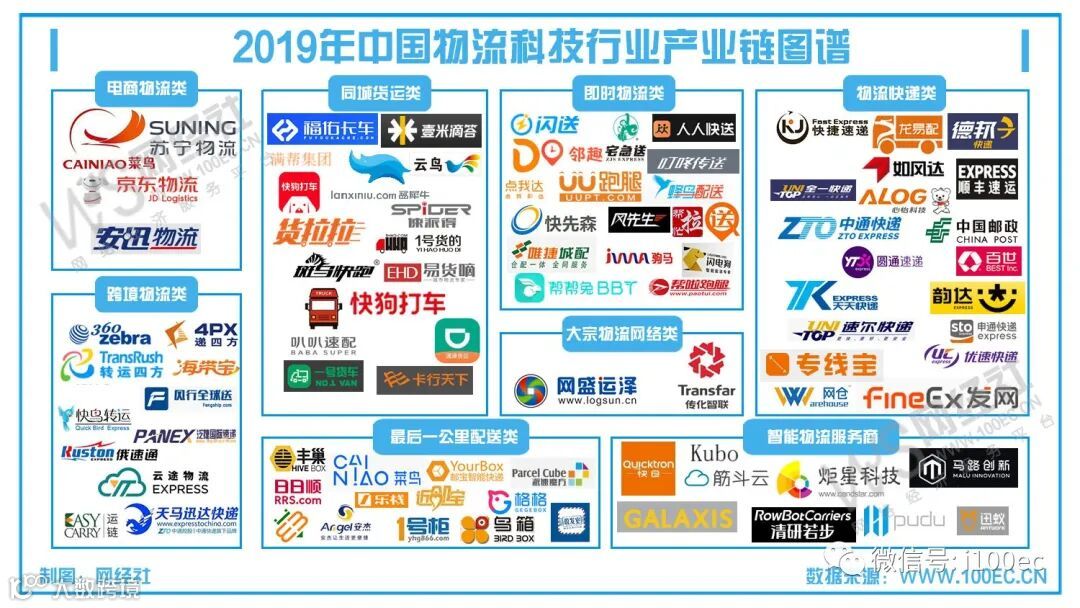 中国已成为全球第一快递大国,而电商物流衍生出多种业态,并朝着多元化、智能化、开放化、国际化方向发展,热门行业及主流玩家包括:(1)物流快递类:顺丰、申通、圆通、韵达、汇通、中通、天天快递、优速快递等;(2)电商物流类:苏宁物流、菜鸟、京东物流等;(3)跨境物流类:斑马物联网、海带宝、转运四方、风行全球送、快鸟转运、天马迅达快递等;(4)即时物流类:美团配送、蜂鸟即配、闪送、达达、UU跑腿、顺丰同城急送等;(5)同城货运类:福佑卡车、壹米滴答、云鸟、货拉拉、快狗打车、滴滴货运、卡行天下等;(6)最后一公里类:速递易、丰巢、E邮柜、菜鸟驿站、e栈等;(7)智慧物流服务商:筋斗云、炬星科技等;(8)大众物流网络类:网盛运泽、传化智联等。