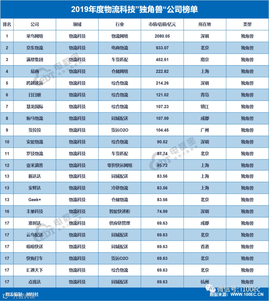 《报告》显示,2019年物流科技共有22家“独角兽”,同比增长37.5%,总估值达768.33亿美元,同比增长3.1%,平均估值为34.92亿美元。菜鸟网络(298.72亿美元)、京东物流(134亿美元)、满帮集团(65亿美元)领衔前三位。2019年物流科技“千里马”共12家,总估值高达376.25亿元,平均估值31.35亿元。数据显示,2019年物流科技融资数66起,同比下降21.4%;融资额568.66亿元,同比下降13.97%。