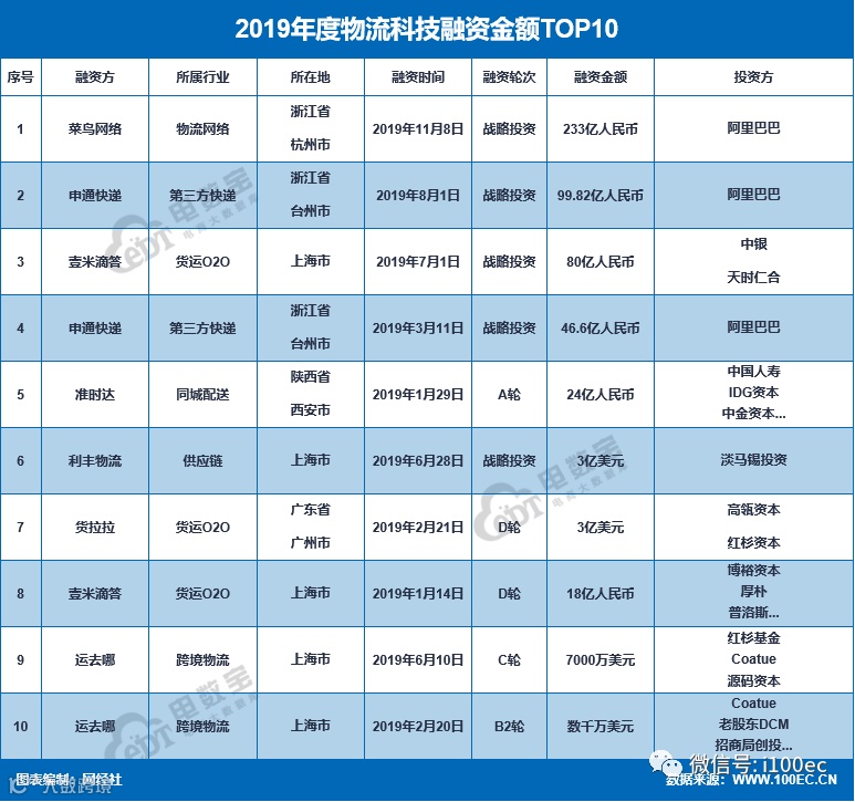 《报告》显示,2019年物流科技融资数66起,同比下降21.4%;融资额568.66亿元,同比下降13.97%。其中,前十大融资事件包括:菜鸟网络获233亿人民币战略投资、申通快递获99.82亿人民币战略投资以及46亿人民币战略投资、壹米滴答获80亿人民币战略投资以及18亿人民币D轮、准时达获24亿人民币A轮、利丰物流获3亿美元战略投资、货拉拉获3亿美元D轮、运去哪获7000万美元C轮以及获数千万美元B2轮;融资总金额达547.2亿元。