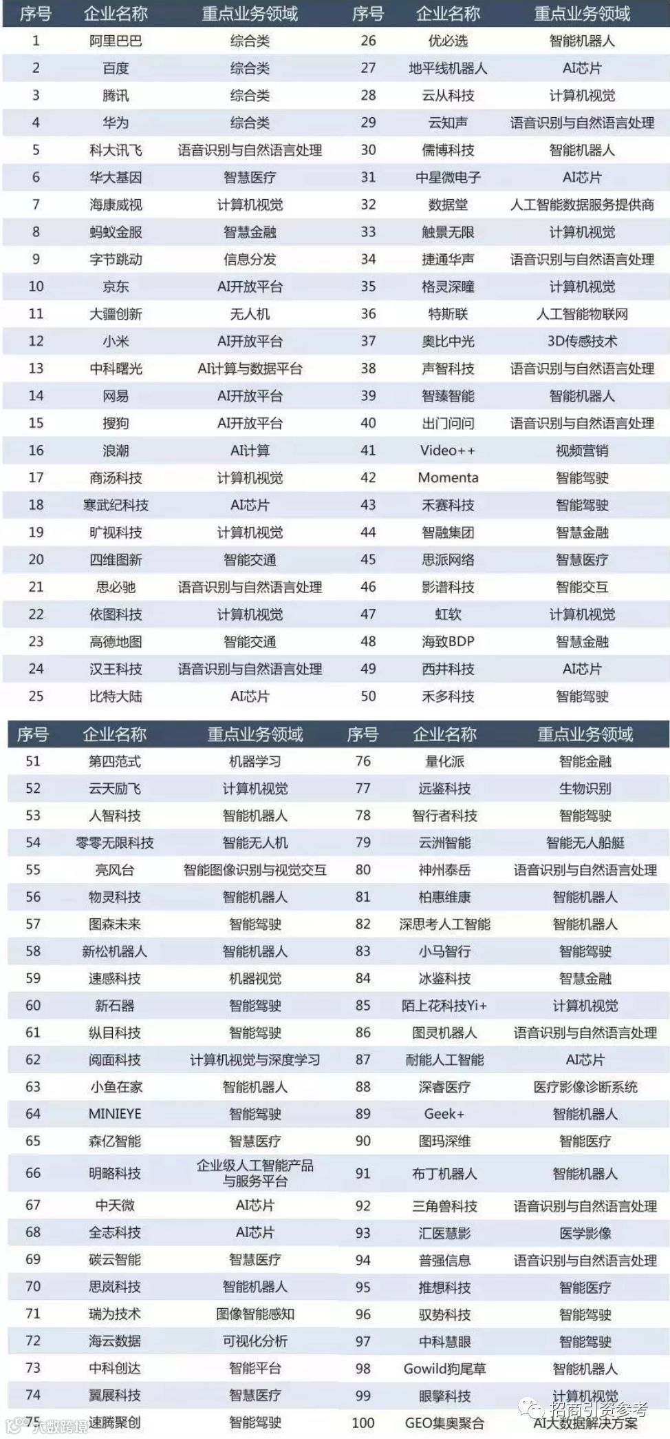 2019人工智能企业综合实力100强名单