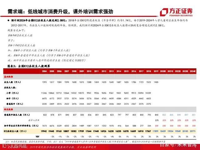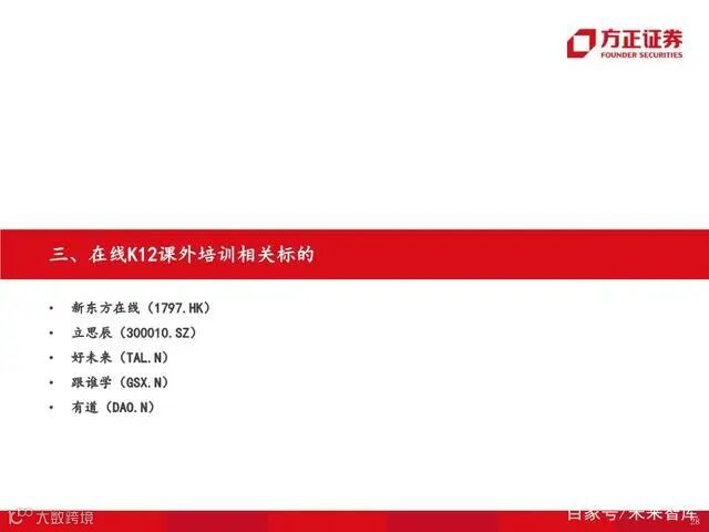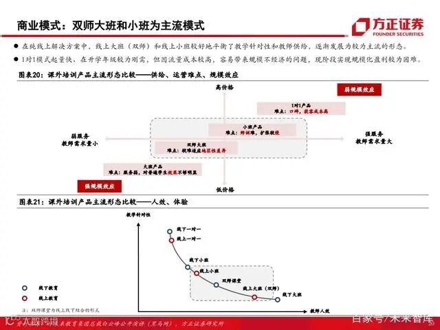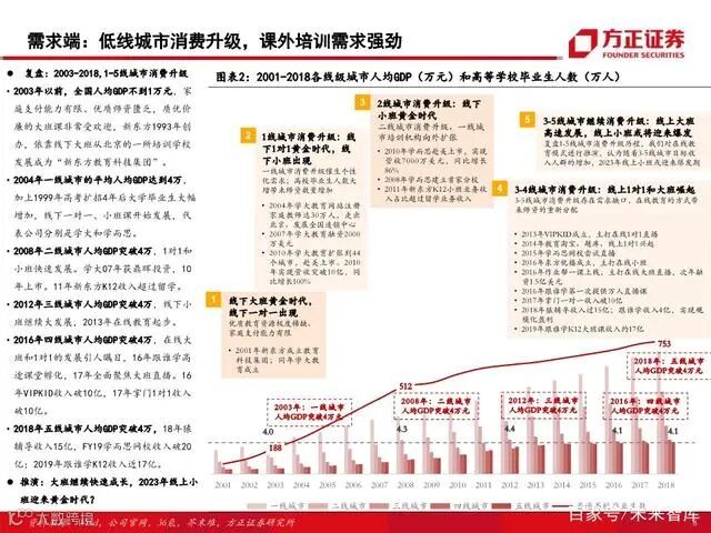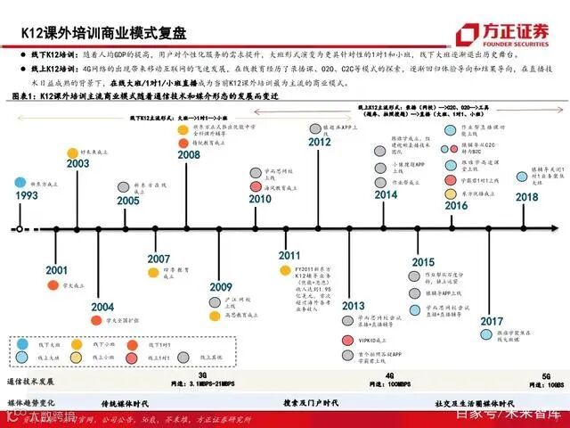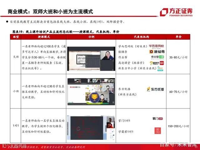 从时间周期看,K12课外培训行业大约每五年诞生一个主流商业模式。通过复盘K12课外培训的商业模式演变历程,我们发现以全国人均GDP破万元的2003年为起点,线下培训经历“大班-1对1-小班”的形态演变历程,而在线教育经过早期录播、O2O、工具等探索,在通信技术和媒体演进的双重推动下,形成以直播为载体的“双师大班+互动小班+1对1”的格局。
