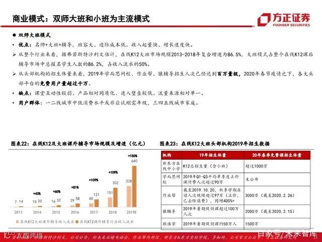 双师大班:盈利关键点是销售费用率(转化率、续班率、报名科次)。大班模式的优点是班容大、边际成本低、收入起量快、增长速度快,2019年占整体在线K12课后辅导市场总报名学生人数的86.2%。2020年春节疫情之下,头部公司免费用户量迅速达 到千万量级;其不足在于课堂互动性较弱、产品相对同质化、进入壁垒较低、流量来源相对单一。