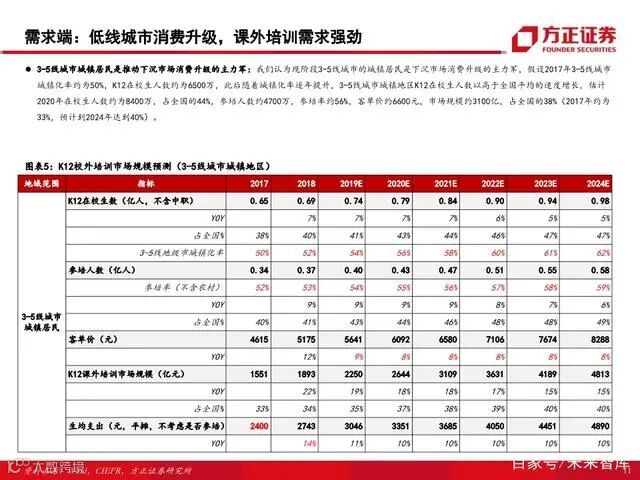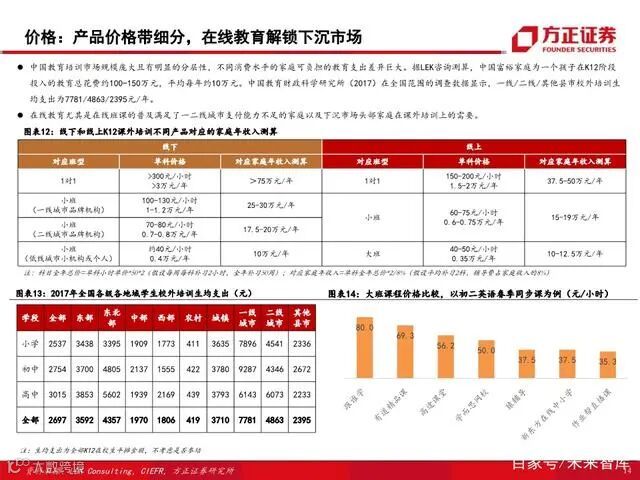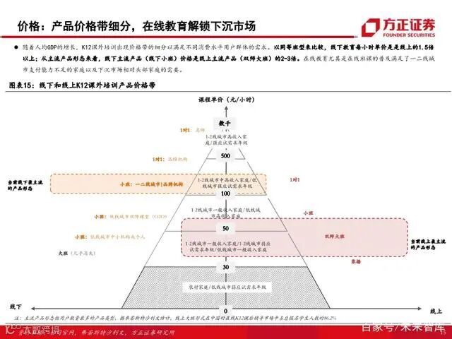 从供需角度看,在线教育解决了各线市场需求升级背景下的结构性供给问题目前一二线城市主流的线下K12产品采用小班模式,品牌机构每小时单价在80-130元左右,主要面向家庭年收入17.5万以 上的群体,一二线城市支付能力不足的家庭的线下课外培训需求难以得到满足;而3-5线城市市场则缺少优质供给。