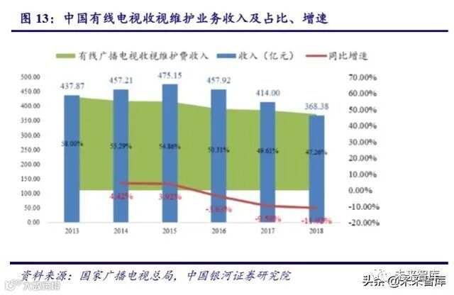 收视维护业务指对有线电视线路的维护,缴纳收视维护费的用户可以收看免费频道。我国有线电视网收入的最主要来源是收视维护费,但其占比已连续六年下滑,2018 年有线 广播电视收视维护费收入占比不到 50%,相比 2017 年下降 2.35 个百分点,相比 2013 年已 下降 10.74 个百分点。