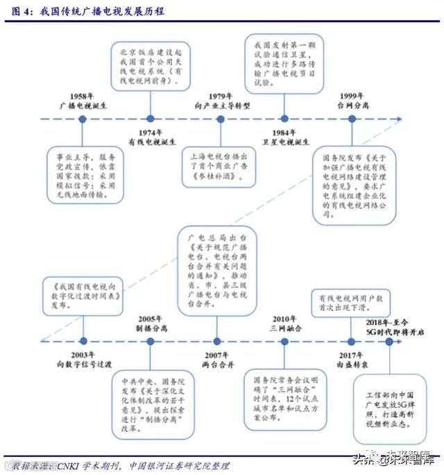 我国传统广播电视行业诞生于 1958 年。诞生之初,广播电视完全是为党政宣传服务。直到 1979 年后,我国广播电视行业才开始向产业化、商业化转型,文化需求的释放促成了 一段传统广电的高速增长期。然而,2017 年,由于传统广电遭受 IPTV 冲击,长期垄断业 务被打破,最主要业务有线电视网甚至首次出现下滑,传统广播电视行业将持续面临由盛 转衰的态势,但随着 5G 牌照获得后,国网整合等多因素推进,新兴产业将为广播电视行 业带来新的发展机遇。