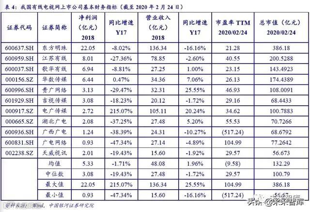 2018 年整个板块的公司从净利润和营业收入角度表现稳健,无一家亏损,东方明珠盈 利能力最强。但行业整体创收能力和盈利能力出现下滑,2018 年净利润增速平均为-1.71%, 中位数为-19.43%;营业收入增速均值为 1.96%,中位数为-1.72%;2020 年 2 月 24 日行业 市盈率平均为-9.58 倍,中位数为 29.57 倍。