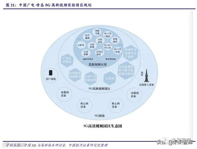 近年来随着 5G、VR、8K、人工智能物联网等新兴技术的快速发展,未来广电将加快 这些高新技术的运用,从而实现产业变革。以 2019 年 8 月发布的《中国广电·青岛 5G 高 新视频实验园区规划》举例,未来该园区将重点布局高新视频内容产品创新、高新视频云、 高新视频软硬件设备研发生产、高新视频应用集成创新、内容监测监管与数字版权服务、 高新视频产业运营等六大板块,以科技创新为支撑,以内容生产为核心,应用于沉浸式体 验、VR、AR 等多种新兴产业,构建高新视频新业态。